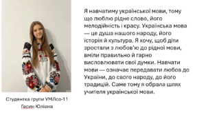 Думками про свій вибір професії вчителя української словесності діляться першокурсники спеціальності «Середня освіта (Українська мова і література») факультету філології (група УМЛсо-11).