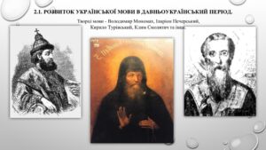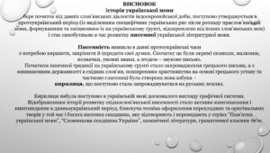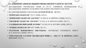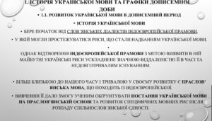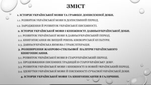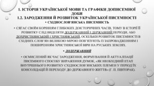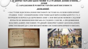 Викладачка розкрила стисло еволюцію української мови, починаючи від спільнослов’янської доби, розглянула питання про додержавний і державний періоди в розвитку української писемності, виникнення й використання системи кириличного письма, поширення книгописання в Київській державі й Галицько-Волинському князівстві, схарактеризувала давньоукраїнську вимову, яка ніколи не припиняла свого існування та впродовж тисячолітньої історії створювала єдиний мовно-культурний простір, була невід’ємною ознакою самобутності й неповторності української мови. За планом лекції висвітлила питання і про розширення жанрово-стильових меж власного книгописання в староукраїнський, новий український періоди, а також у ХХ та ХХІ сторіччях. Особливу увагу звернула на давні різностильові пам’ятки української літературної мови, які відобразили неперервність розвитку власних писемних традицій.