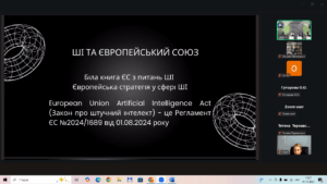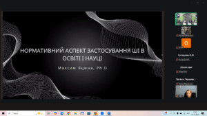 - Максим Яцина, доктор філософії (PhD) за спеціальністю 081 Право, старший викладач кафедри політики у сфері боротьби зі злочинністю та кримінального права КНУВС, виступив із темою «Нормативний аспект застосування ШІ в освіті і науці»;